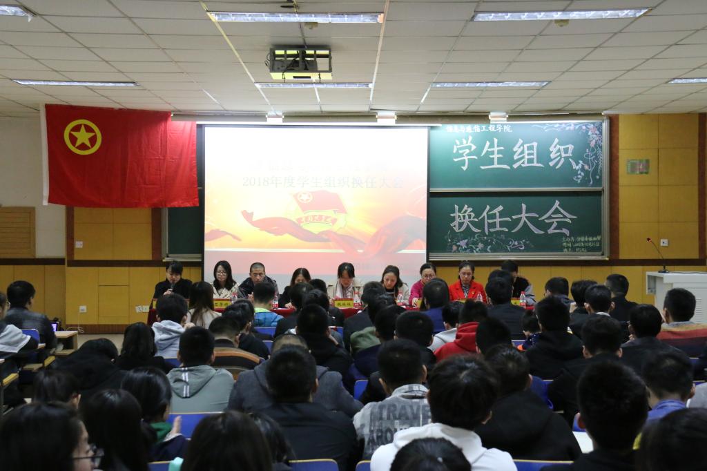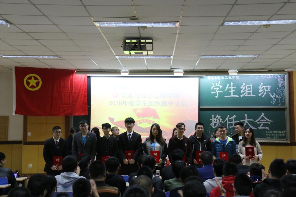 2018年10月23日下午,信息与通信工程学院18级学生组织换任大会在09202教室举行。出席本次大会嘉宾有信息与通信工程学院党委副书记兼副院长魏媛媛教授、学生科科长任雁老师、学生科陈淑霞老师、邢杰老师、赵健东老师、石芳娟老师、柴锂娟老师、林乘庆老师。参加大会的学生有2017年度学生干部、2018年度学生干部以及2018年度学生代表。会议由张永玲老师主持。