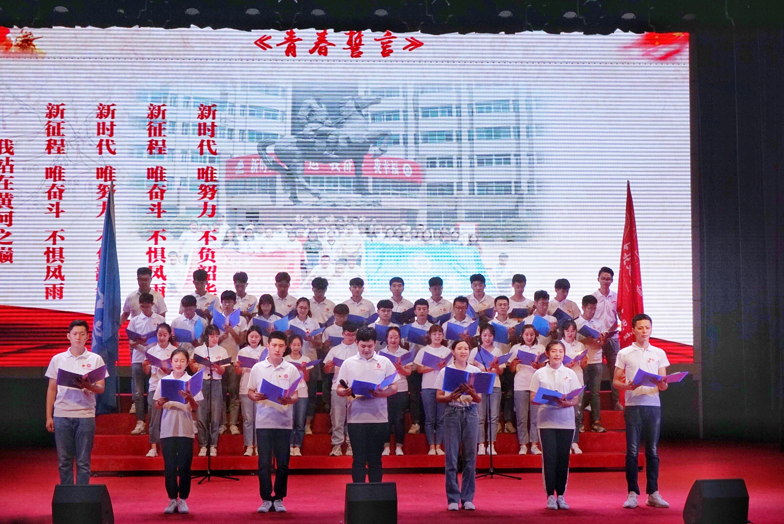 此次宣讲会分为“武乡寻旧址”、“重走抗大路”、“热血洒太行”和“历史新篇章”四个篇章,主讲人王宇、于静怡、徐冰、邱雨轩、贾尚盐、张光年、李娇等给同学们分别讲述了刘鼎校长那一代青年人创办太行工业学校的理想与信仰、以齐心等老一辈革命家为代表的抗日军政大学一分校女生队生活战斗的场景、左权将军为参与指挥百团大战而忍痛与爱妻爱女分别的感人故事、当年抗大学员们与浆水镇人民的深厚情感、统一战线的建立在新中国成立过程中发挥的重要作用以及西柏坡的革命历史和西柏坡精神的时代内涵。他们的讲述配以图片和视频等,生动感人,激情昂扬,感染了现场的所有师生。最后,所有队员铿锵有力的齐声朗诵《青春宣言》:“我以青春的名义许下誓言,立鸿鹄志,做奋斗者!”更是将整个宣讲会推向了高潮。