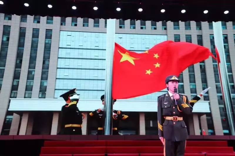 在国旗护卫队队员现场出旗后,全场师生起立,齐声高唱国歌,唱出心中对祖国的那份崇敬与热爱。