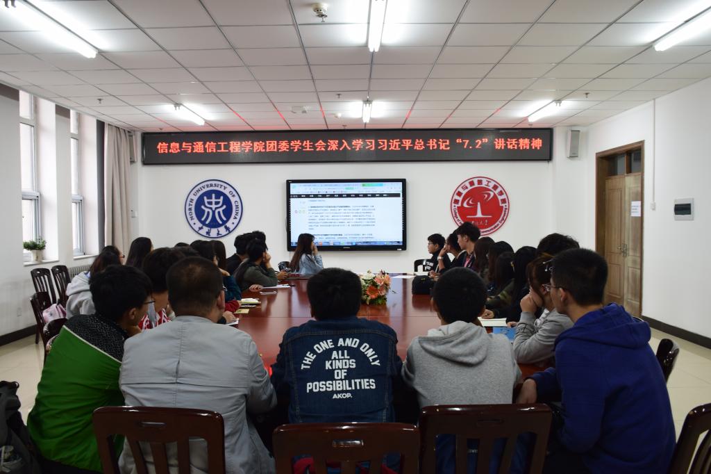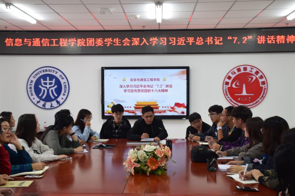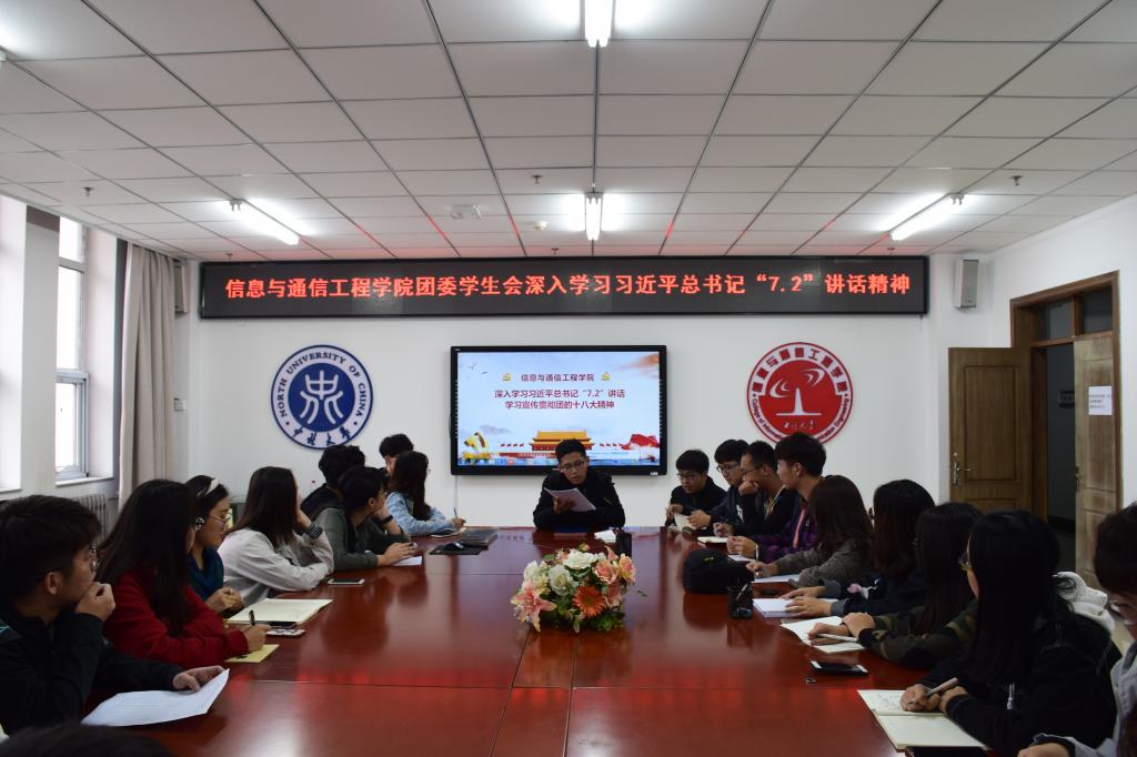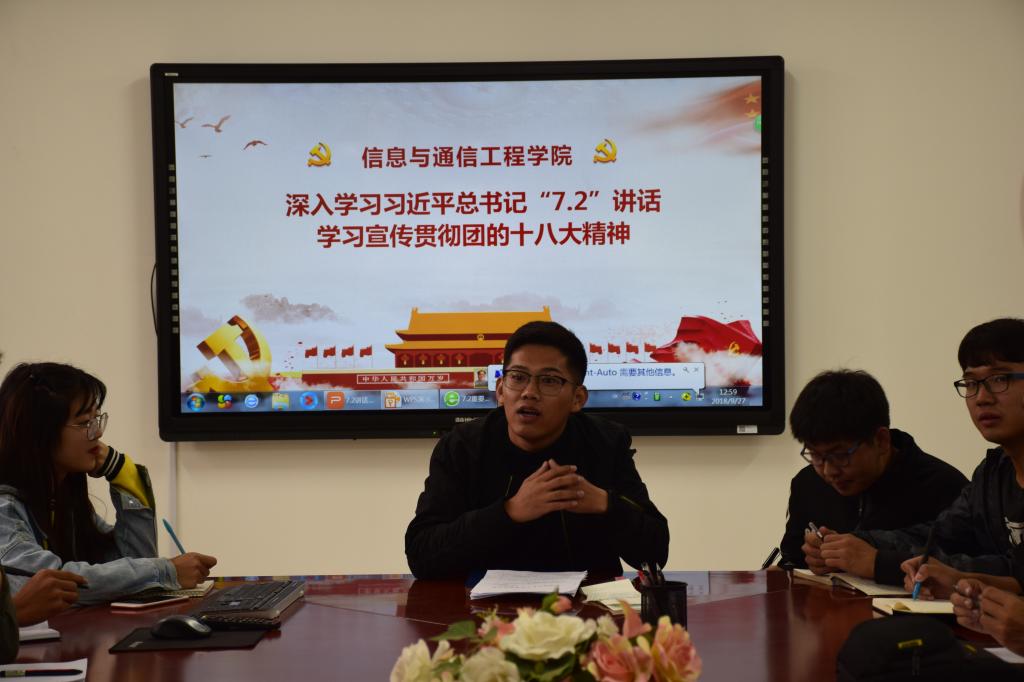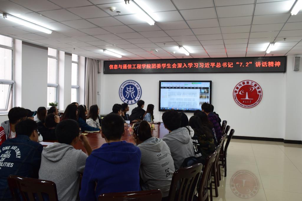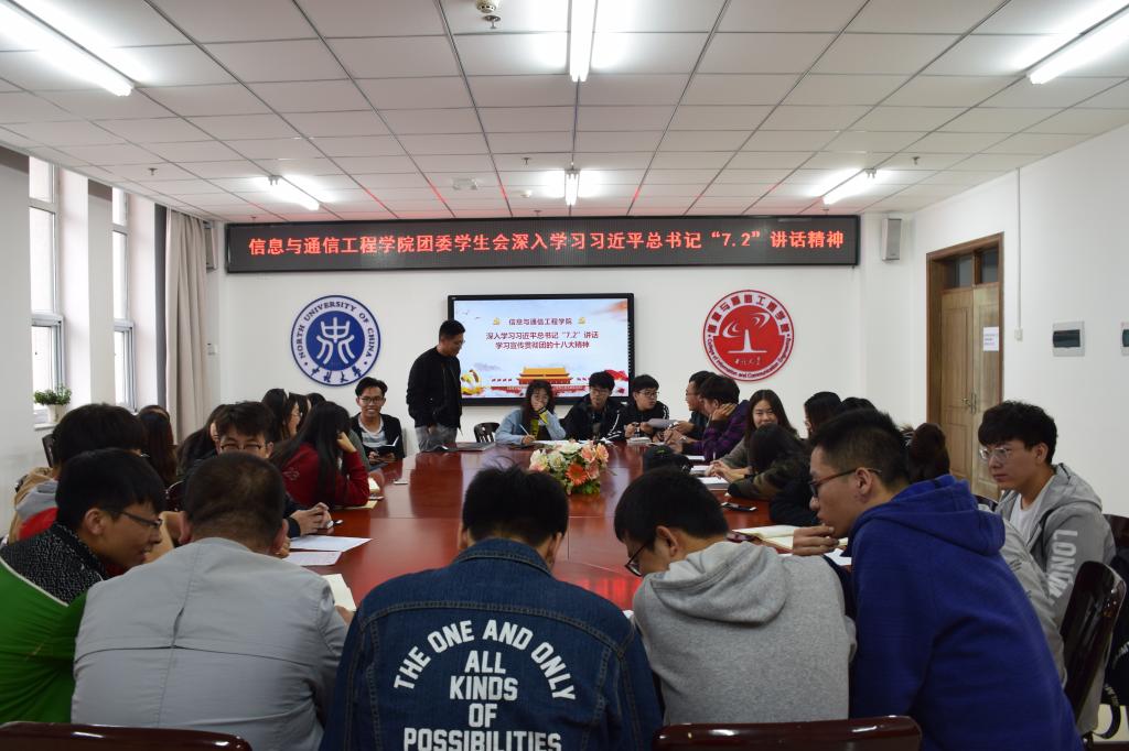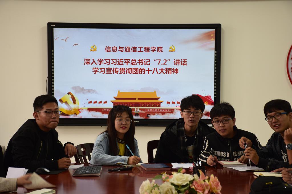 为深入学习贯彻习近平总书记7.2讲话和团的十八大精神,用习近平新时代中国特色社会主义思想武装共青团、教育青少年,推动新时代青年和共青团工作开创新局面、实现新发展,信息与通信工程学院由林乘庆老师组织分团委分科协部长级以上的学生干部于2018年10月17日开展了学生干部学习习近平总书记“7·2”重要讲话精神专题学习班。在学习期间,学生干部围绕“习近平总书记关于青年工作的重要思想”“继续改革攻坚”“聚焦主责主业”“全面从严治团”等专题做了详细讨论。