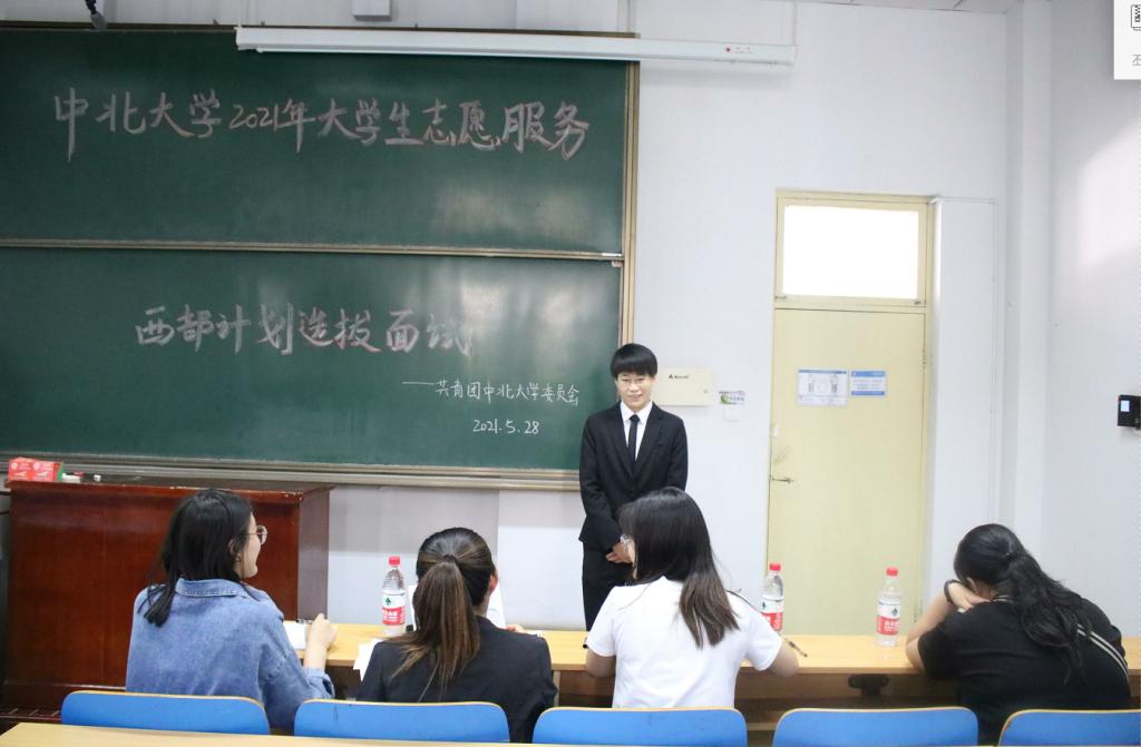 我校西部计划志愿者的选拔包含笔试与面试两个环节。笔试于5月25日在11308H教室展开。考场中,每一位同学都十分认真,以最严谨的态度对待这场考试;笔试成绩为前50%同学进入面试环节,面试于5月28日在11207H教室展开,由校团委党生焕老师、校团委王彩萍老师与中北大学青年志愿者协会主席团成员刘瑞、薛舒月担任评委。其中朔州校区学生采用线上面试。面试中,同学们以最饱满的状态应对面试官的提问,展现出了中北大学青年学生的良好风貌与志愿精神。