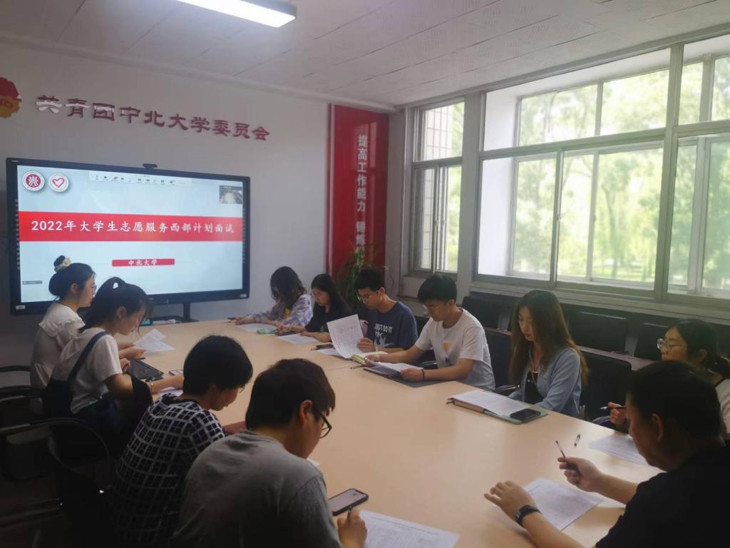 5月27日,我校2022年“西部计划”志愿者面试工作在校团委会议室举行。校团委书记顾宁、校团委组织宣传部部长崔媛、校团委实践部部长王彩萍、西部计划项目办负责老师焦婷婷 、中北大学第一届研究生支教团负责人、校团委学生兼职副书记孙碧野以及校青协主要学生干部担任评委。