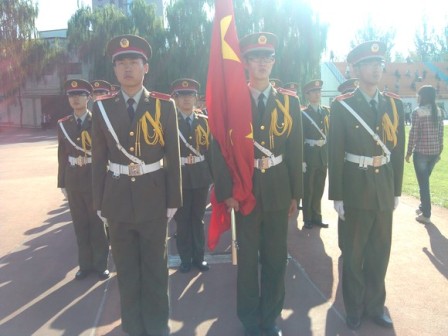 上午八点左右,护卫队队员们已经在主教学楼下集合完毕,队员们精神饱满,整装待发。约八点四十分,护卫队出发,队伍带到指定地点,等待着典礼的召开。九点整,典礼开始。在主持人介绍到场嘉宾之后,升旗仪式开始。在所有新生的注视下,护卫队迈着有力地步伐,走向旗台。随着雄壮的国歌声响起,五星红旗冉冉上升,飘扬在中北大学体育场上空。升旗仪式结束后,护卫队从原路返回至主楼下,本次活动圆满完成。