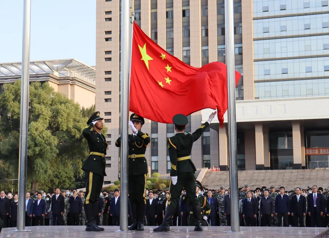 伴随着庄严的国歌声,国旗护卫队护着国旗缓步向前。凝聚着无数革命先烈鲜血的五星红旗冉冉升起。全体人员低头默哀,深切悼念。
