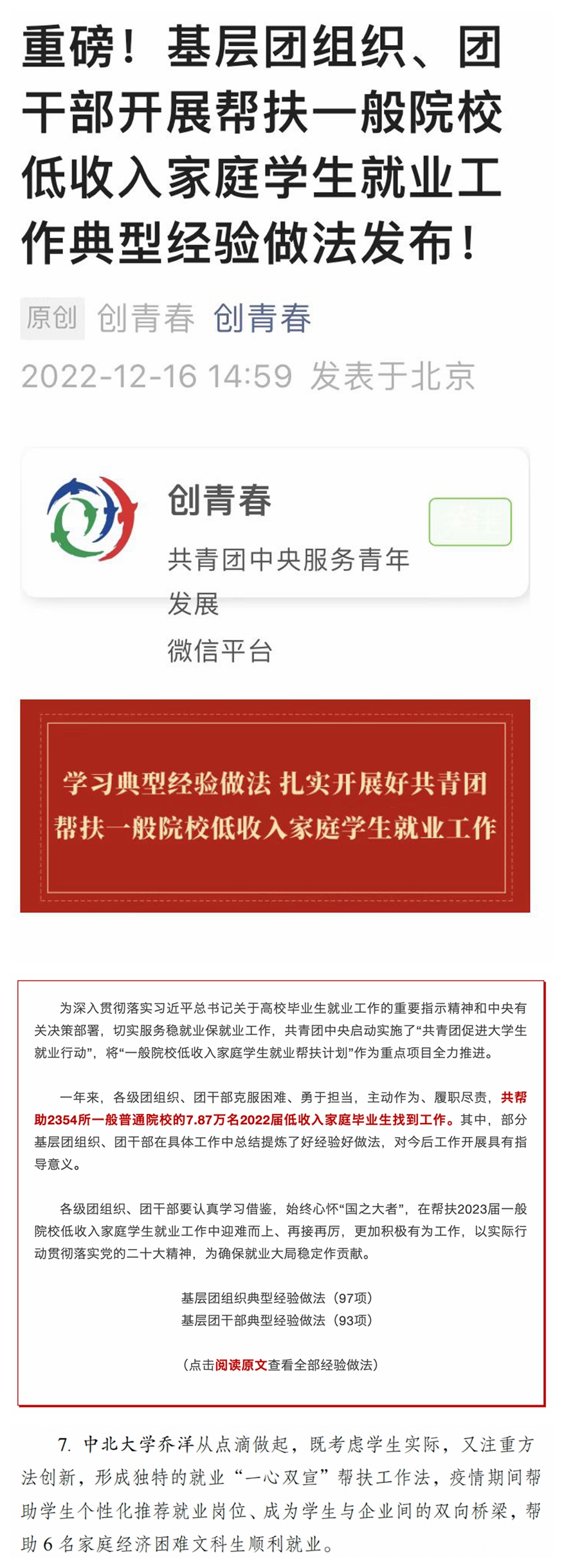 近日,团中央公布基层团组织、团干部开展帮扶一般院校低收入家庭学生就业工作典型经验做法。我校乔洋老师被团中央选为“基层团干部就业帮扶典型”(全国共93项)。