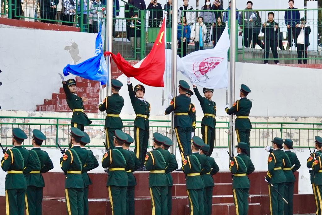 活动在升国旗仪式中拉开帷幕,国旗护卫队迈着铿锵有力的步伐,昂首阔步,护卫着五星红旗走向升旗台。随着国旗冉冉升起,在场师生满怀激情、齐唱国歌,场面庄严肃穆。