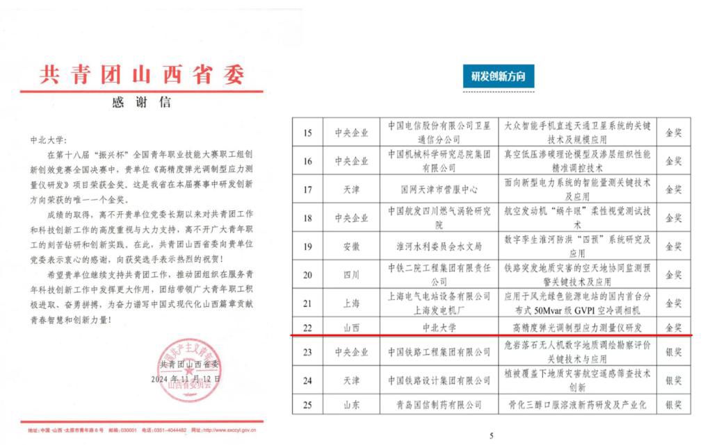11月5日,由共青团中央、人力资源社会保障部主办的第十八届“振兴杯”全国青年职业技能大赛职工组创新创效竞赛在重庆举行。我校电气与控制工程学院李克武老师申报的项目《高精度弹光调制型应力测量仪研发》(指导老师:赵正杰)获金奖,是我省在本届赛事研发创新方向获得的唯一一个金奖,也是我校首次在该赛事上荣获金奖!半导体与物理学院白建东老师申报的《基于人工智能的宽屏高动态光纤振动传感技术》获国赛优胜奖,省赛一等奖!