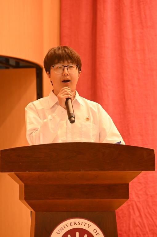 “校园十大青年人物”获奖学生代表、航空宇航学院学生尹渊发言时回顾了自己投身科研、大胆创新并取得一系列研究成果的心路历程,勉励大家以“学思践悟、砥砺奋进“的心态”坚定理想信念,以“行则将至,做则必成”的状态扎根工作,彰显青年担当、庚续红色精神、厚植家国情怀。
