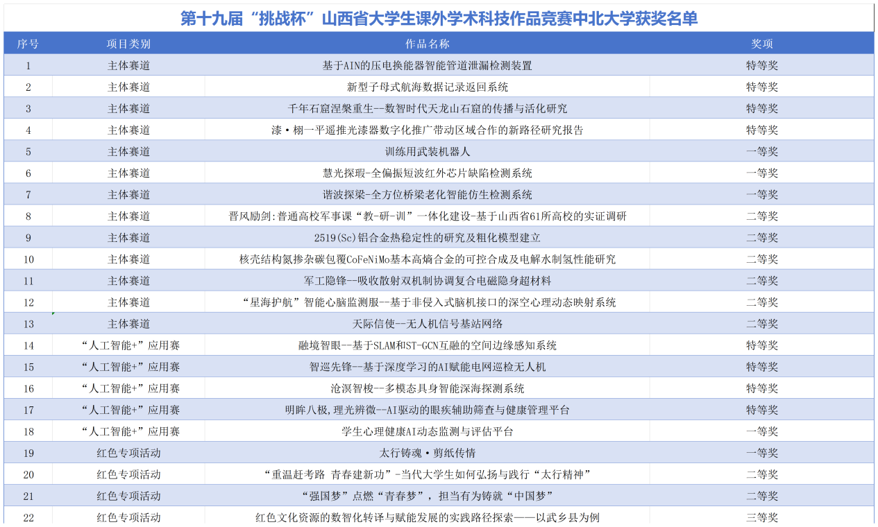 近日,第十九届“挑战杯”山西省大学生课外学术科技作品竞赛成绩揭晓,我校共有22项作品获奖,其中特等奖8项,一等奖5项,二等奖8项,三等奖1项,获奖数量位居山西省前列。