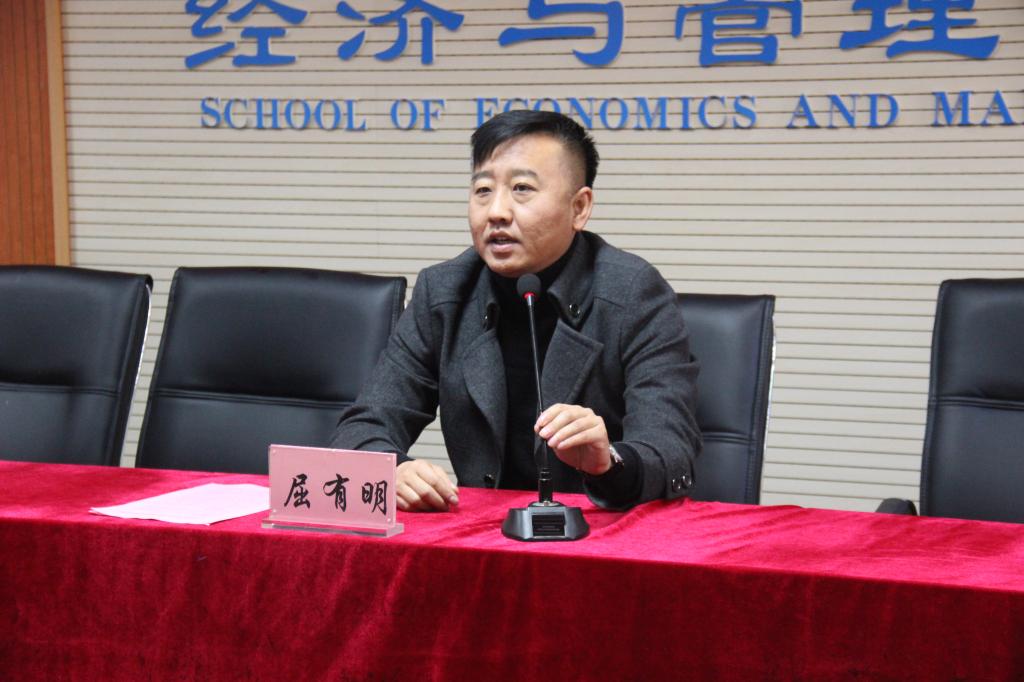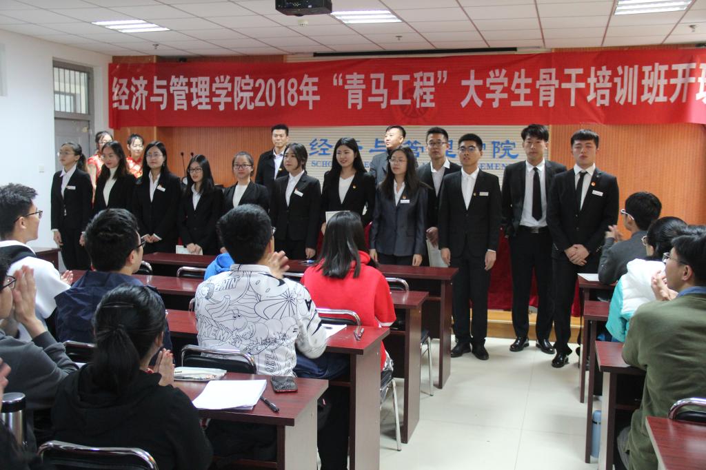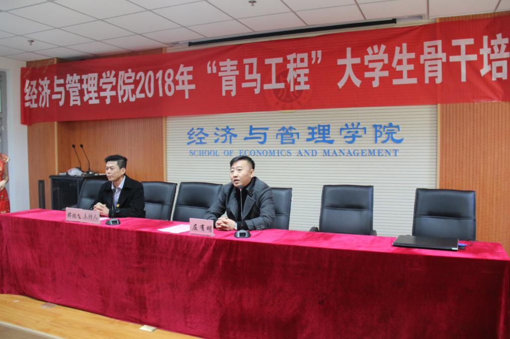 为提高大学生骨干的思想政治素质水平和实践能力,经济与管理学院在10月27日至10月28日开展的“青马工程”大学生骨干培训班的开班典礼及培训课程。开班典礼在逸夫楼301会议室举行,由院团委书记那鹏飞主持,院党委副书记屈有明担任嘉宾,我院部分学生干部及上届学生骨干参与典礼。培训课程以学员自主活动和讲师授课为主要培训方式。