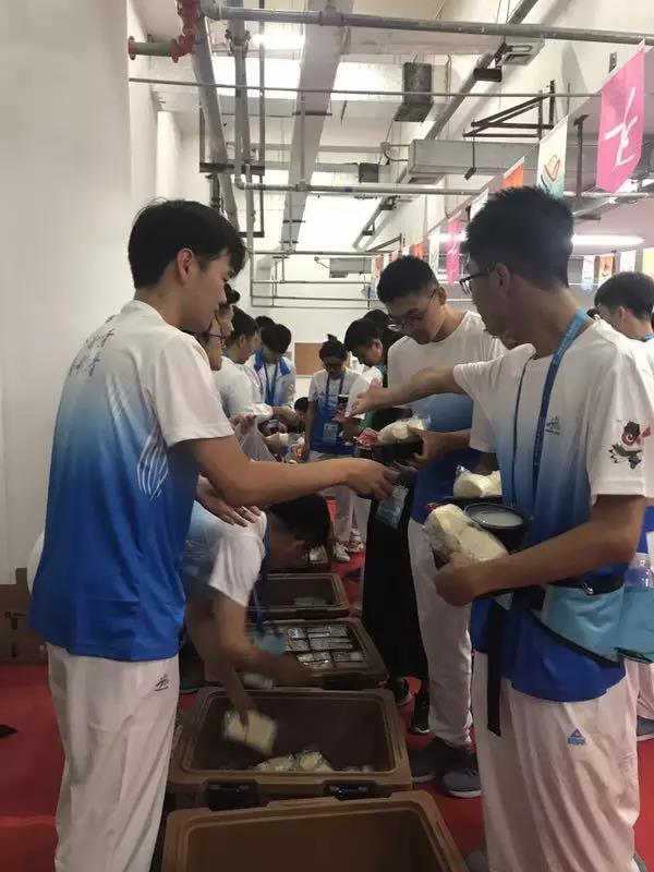 在前几天的志愿服务中,大家分工合作,各司其职,为运动员及教练员穿引入场牌。志愿服务第四天,运动员陆续到场,这时候其中最忙碌的当属运动员接待小组的成员。将运动员从青运村接至热身场馆,马不停蹄。最忙的时候回来志愿者之家刚坐下没一会,就又被任务叫走,午饭时间也只得呆着在抵离站点中心解决。