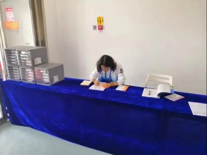 总记录准备完毕。该处志愿者十分忙碌,准备着正式比赛时用的表格及提前熟悉各种相关事务。