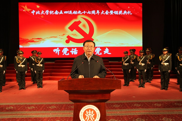 校党委书记李忠人教授发表重要讲话。他表示,2016年是全面建设小康社会的决胜年,也是十三五规划的开篇之年,也是推进战略性改革的攻坚之年,更是我校召开党代会凝心聚力谋发展的作为之年,在战略发展上,校党委提出了中北百年百强中北梦奋斗目标,就是在2041年中北建校100周年的时候,要把学校的综合实力排名争取进入到我们国家本科大学的前一百名;他强调,未来的五年,首先要把学校打造成兵工中北、创新中北、美丽中北、和谐中北、特色鲜明的具有重要影响的高水平的教学型研究型大学。他希望广大青年学生自觉践行社会主义核心价值观,坚定理想信念,把人生追求融入实现中国梦的共同理想中;把握人生学习的黄金阶段,勤奋刻苦钻研,练就过硬本领,为实现中国梦集聚青春智慧;把握时代发展特征,创新、创业、创优,服务发展大局,在实现中国梦的进程中建功立业;善于发现机遇,敢于抢抓机遇,勇于投身创新创业实践。希望各级团组织坚持问题导向,推进改革创新,凝聚青年师生,服务改革发展,为实现百年百强中北梦奉献青春力量。希望全校各级党组织、各单位要从党和国家发展的战略高度,从学校持续健康发展的全局高度,充分认识做好青年工作的重要意义,加强对团学工作的领导和支持力度。李书记表示,新常态、新担当,新青年、新作为,为中华民族伟大复兴的中国梦而奋斗,是当代青年的历史责任。广大青年要高举爱国主义旗帜,弘扬五四精神,秉承“致知于行”校训,为实现“两个百年”和中北“百年百强”的奋斗目标,汇聚青春力量,谱写更加壮丽的青春篇章!
