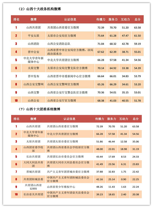 2016年4月27日,《人民日报》联合微博@政务风云榜发布2016年第一季度政务指数微博影响力报告,报告中包含微博影响力全国总榜和各省、自治区、直辖市分榜等,我校共青团官微 @中北大学青年新媒体中心荣登山西十大政务机构微博榜以及山西十大团委系统微博榜,值得一提的是,在山西十大团委系统微博排行榜中,我校团委官微排名第二,仅次于@山西共青团。在山西十大政务机构微博排行榜中位列第五名,是山西高校唯一代表。
