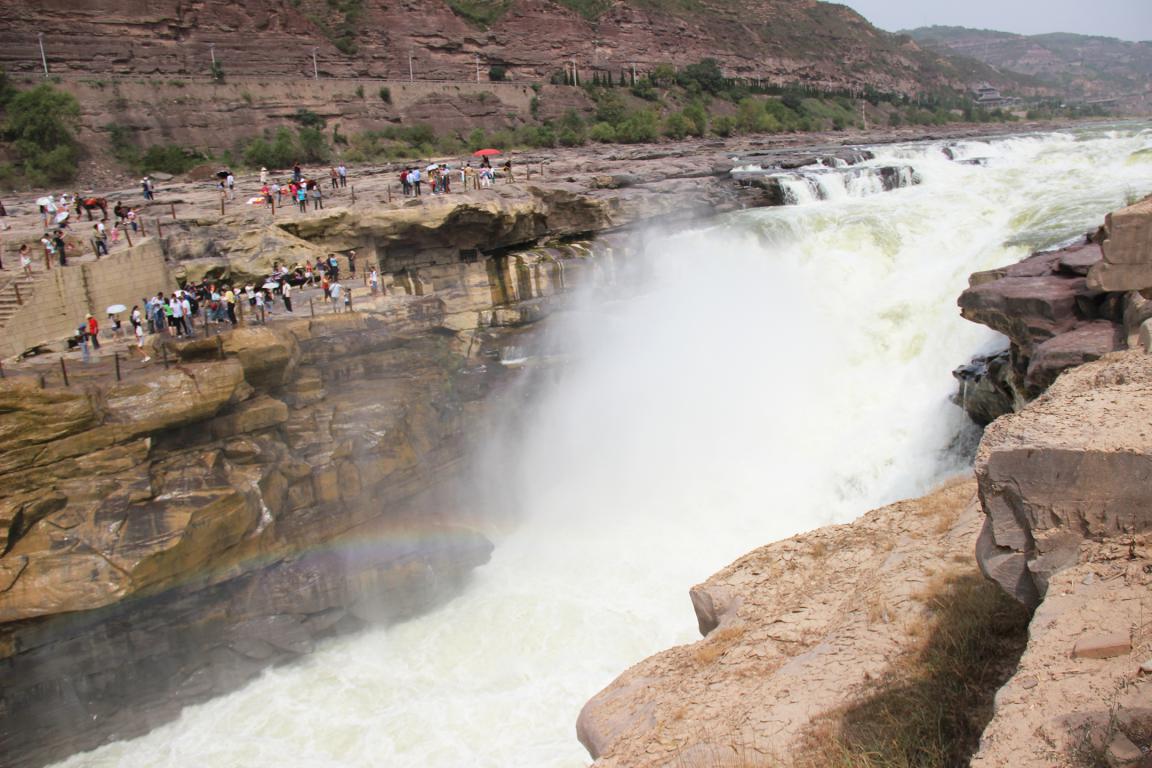 壶口瀑布位于山西省吉县壶口镇,是世界上最大的黄色瀑布,蜚声海内外,慕名前往的游客络绎不绝。瀑布两岸夹山,宽约30米,深约50米,其形如巨壶沸腾,故名壶口。湍流急下,激起的水雾,腾空而起,在阳光的照耀下,升起的彩虹横架其上,尤为壮丽。