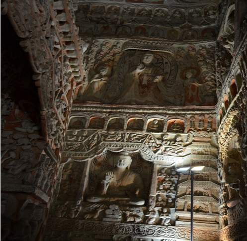 石窟内部仍有精致佛像,体现了古代艺术家精湛的技艺。云冈石窟内建筑是中国传统建筑的文化瑰宝。实践队以云冈石窟等大同历史古迹蓝本,对大同形象标识进行了设计。在云冈石窟内,实践队将保护文物作为主题,呼吁游客保护文物,弘扬优秀传统文化,得到了游客们的肯定和支持。