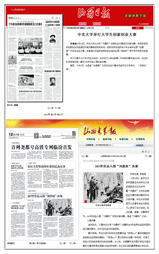 《山西日报》在4月16日要闻第七版以《中北大学举行大学生创新创业大赛》为题报道了我校“刘鼎杯”创新创业大赛的盛况以及我校即将承办2018年山西省“创青春”大学生创业大赛。《山西青年报》在4月16日12版以《中北大学校园科技文化艺术节开幕——267件作品入围“刘鼎杯”决赛》为题图文并茂介绍了开幕式当天“刘鼎杯”决赛、艺术团文艺汇演和社团巡礼等活动。《太原晚报》在4月16日头版标题及02版以《中北大学创新创业大赛:枕头能催眠、书包能救人……这些创意作品让你脑洞大开》为题宣传了我校自去年以来启动的“刘鼎杯”大赛的学生科技成果,重点推介了《助睡眠的智能枕头》、《“逛”博物馆的眼镜》、《救助儿童的书包》、《有大脑的垃圾桶》等四个学生创新项目。山西新闻网、手机网易网、太原晚报网、山西青年网、梨视频等网络媒体也对活动进行了转发报道。