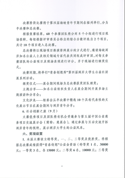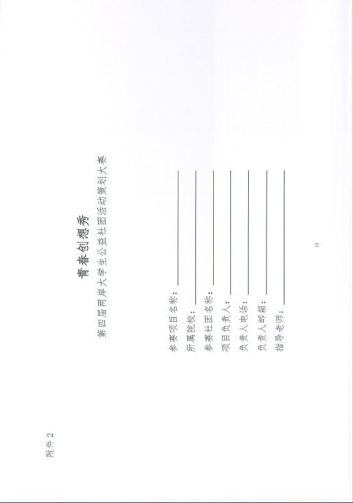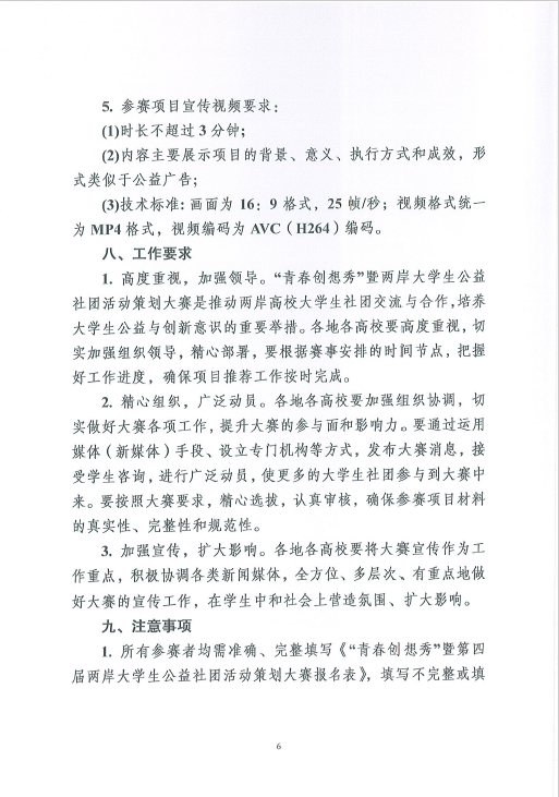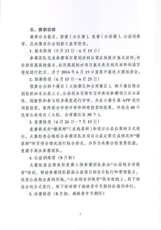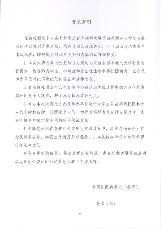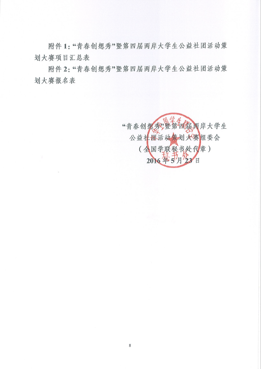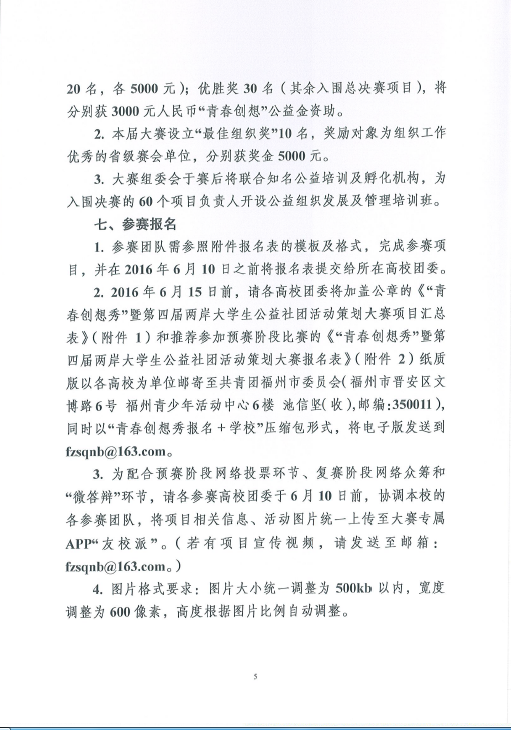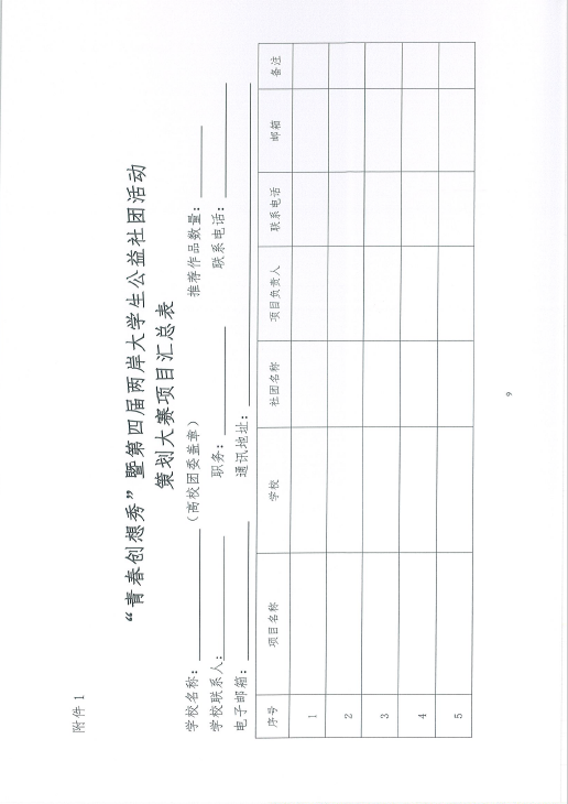 为进一步推动两岸高校大学生社团的交流与互动,培育与扶持两岸优秀公益创客,搭建公益项目与资源的对接平台,为优秀公益项目提供资金支持和专业辅导,激励两岸青年大学生在公益实践中交流合作、共同成长,根据《关于举办“青春创想秀”暨第四届两岸大学生公益社团活动策划大赛的通知》的要求,现将通知转发给你们。请有报名意向的社团认真填写报名所需的项目报名表及相关材料,并于2016年6月8日前集中报送至校团委社团文体部(主楼313),电子版发送至847184148@qq.com(邮件注明:公益社团)。