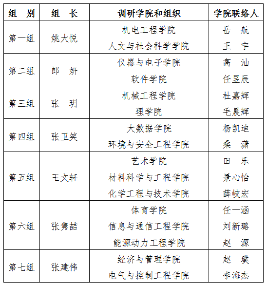 3、各组组长负责对本组调研意见和建议进行汇总,校学生会负责对全部调研结果进行汇总和梳理,形成书面调研报告报校党委参阅。